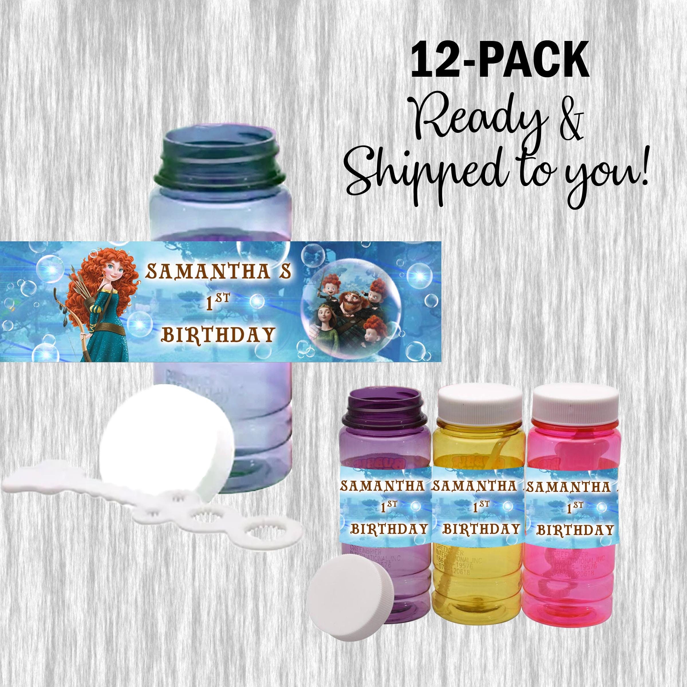 12 pre-labeled bubble bottles, filled and ready for fun.