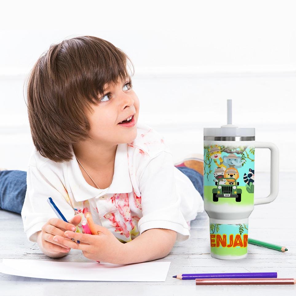 Custom Kids Tumbler 40oz Personalized Name Insulated Bottle Water Safari Theme Orange