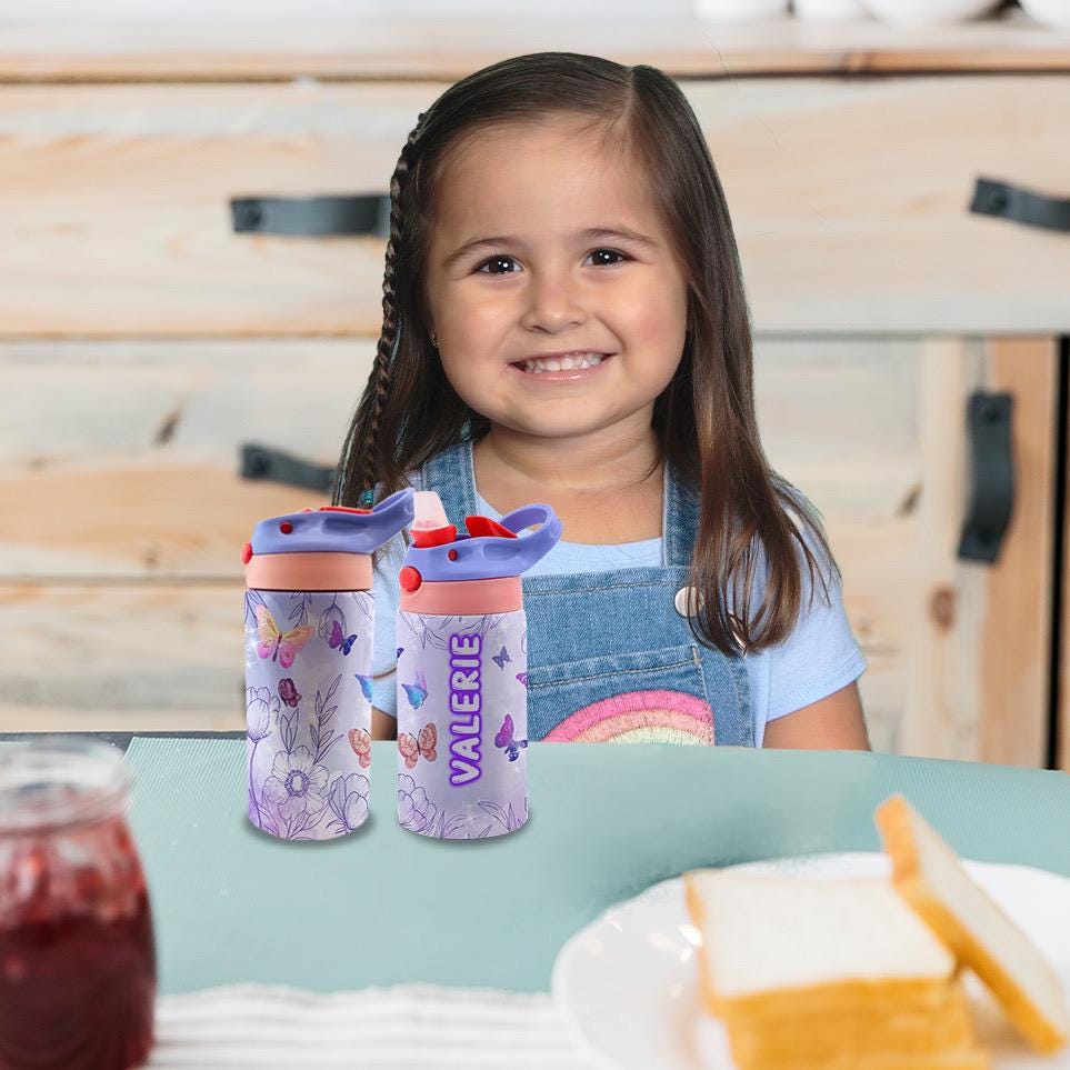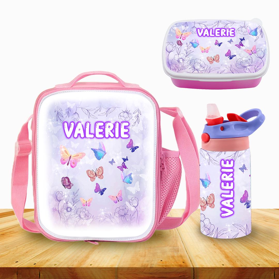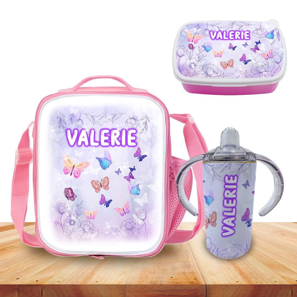 Custom School Kids Bundle Insulated Lunch Bag Snack Box Sippy Cup Bottle Personalized Toddler Set Butterfly Flowers