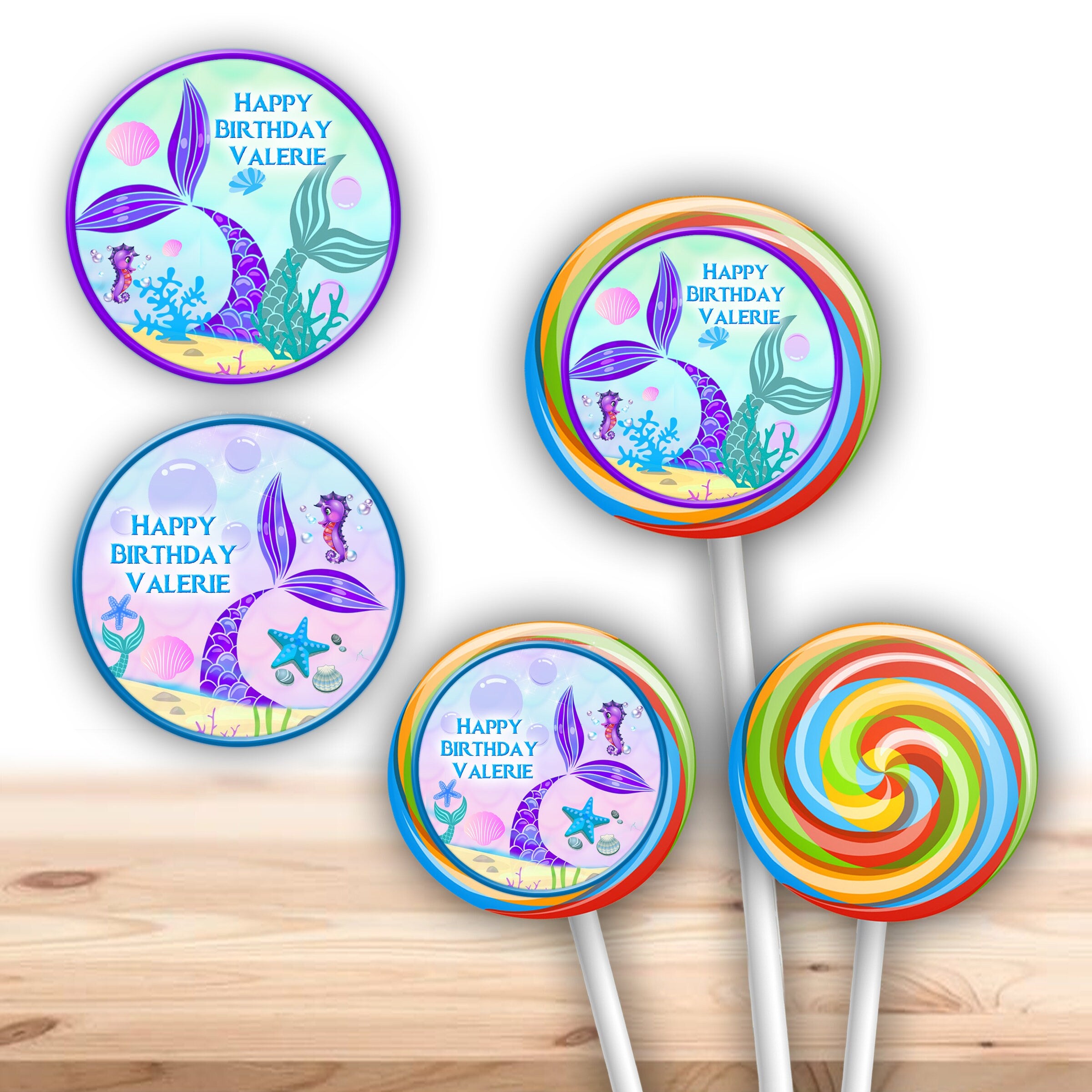 Mermaid Tail Stickers for Birthday Party Decor Lollipops Candy Favors| 12 pack Round Labels