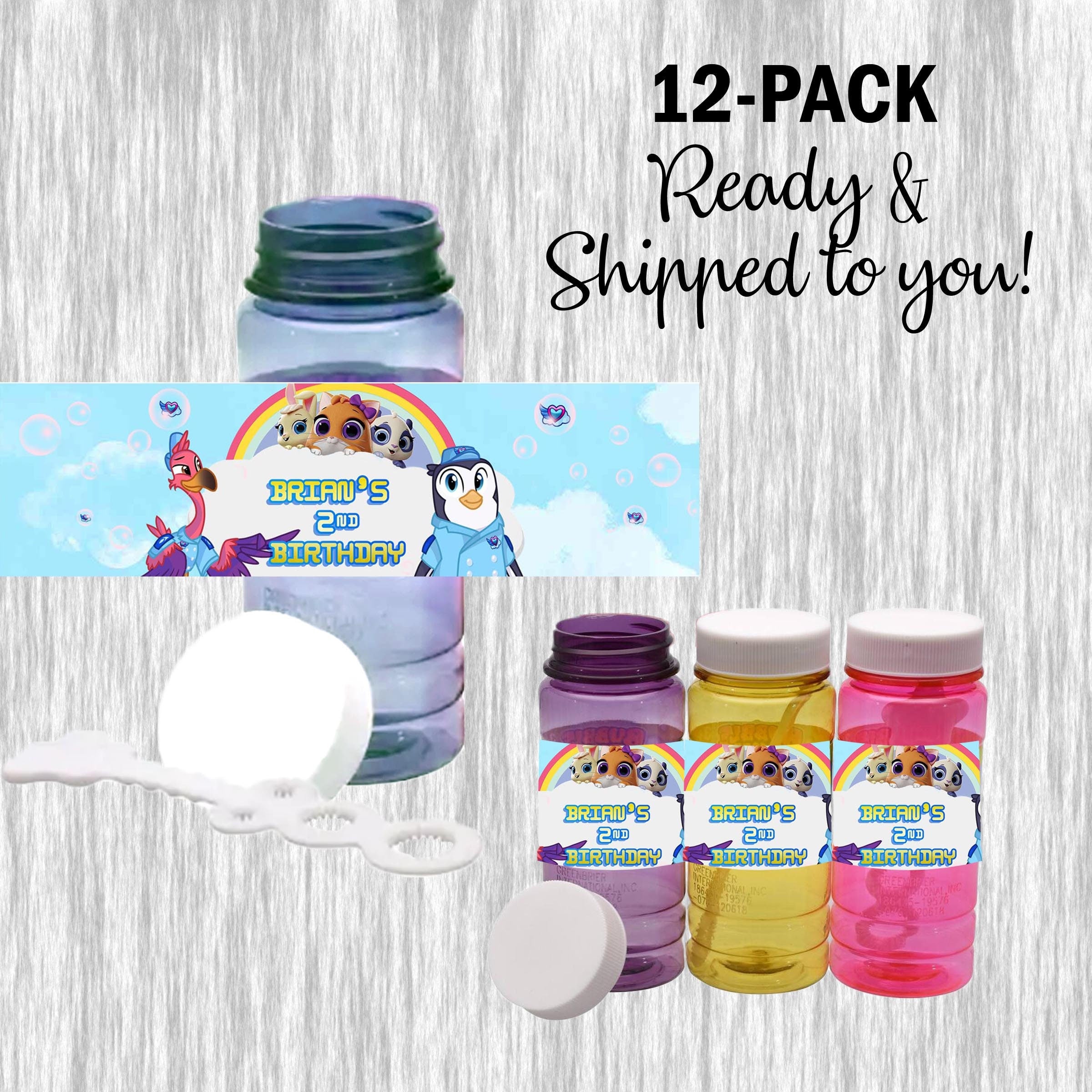12 pre-labeled bubble bottles, filled and ready for fun.